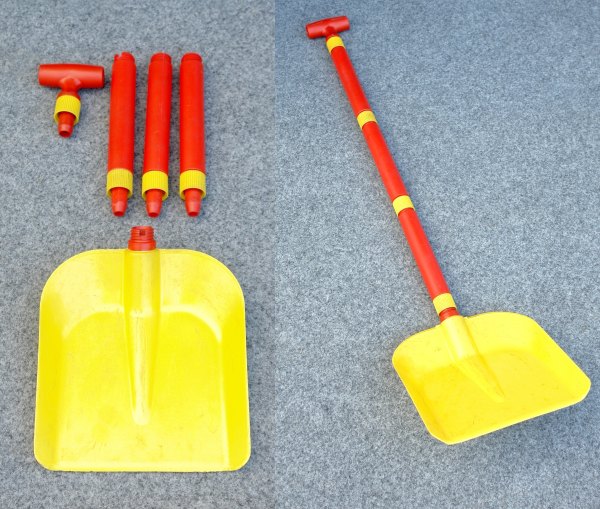 Skládací lopata do auta. Délka 100 cm (složená 30 cm), šířka 28 cm, hmotnost 1 kg.
